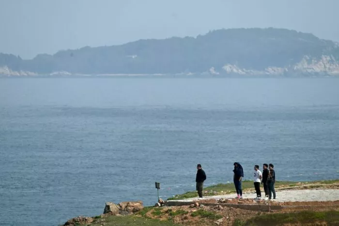 Eine Gruppe von Männern blickt am 16. April 2023 von der Insel Pingtan, dem Taiwan am nächsten gelegenen Punkt Chinas, in der südostchinesischen Provinz Fujian auf die Taiwanstraße.