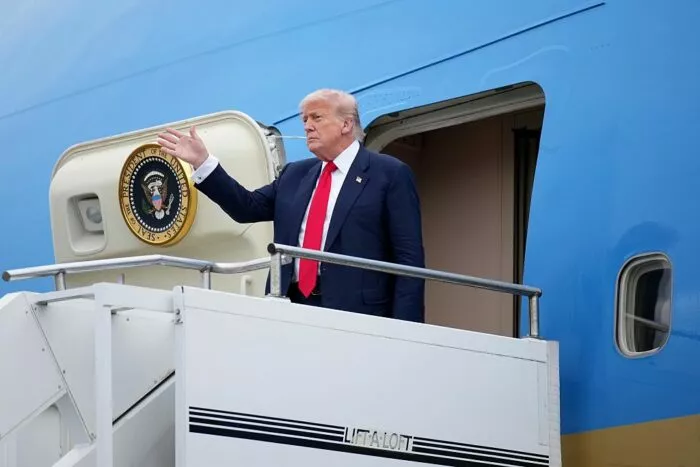 US-Präsident Donald Trump bei seiner Ankunft am Flughafen Glasgow Prestwick am 25. Juli 2025 in Prestwick, Schottland.