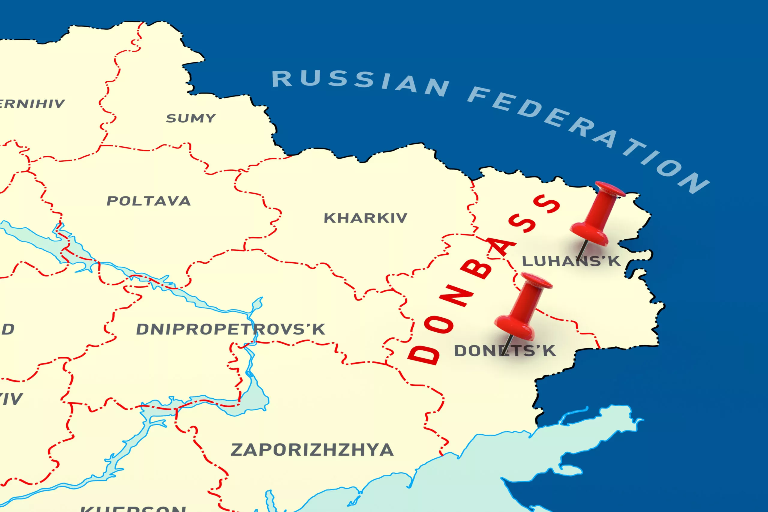 Das Gebiet Donbass mit Markierungen für Donezk und Luhansk.