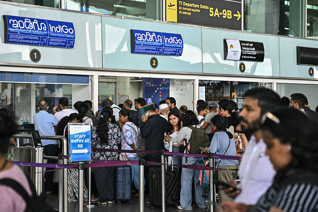 Passagiere warten am 4. Dezember 2025 am Indigo-Airlines-Schalter am Kempegowda International Airport in Bengaluru.