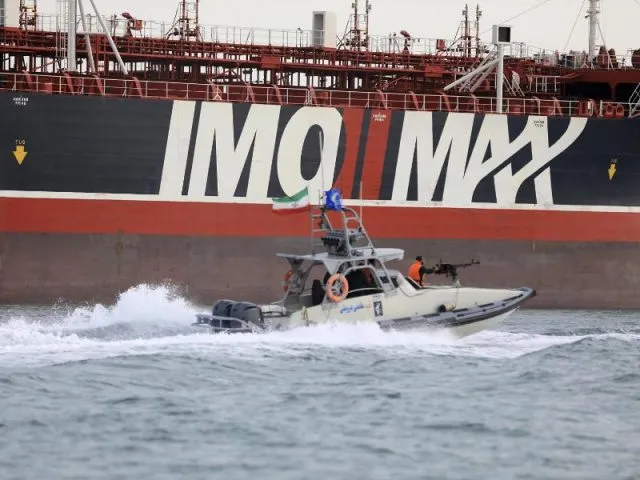 Ein Schnellboot der iranischen Revolutionsgarden steuert auf den unter britischer Flagge fahrenden Öltanker «Stena Impero» zu.