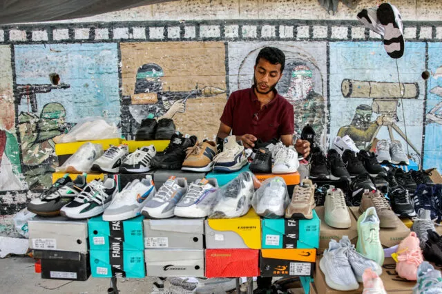 Ein Verkäufer legt seine Schuhe vor einer Wand mit Graffiti aus, die militante palästinensische Kämpfer darstellen. Dies geschieht auf einer Marktstraße in Gaza-Stadt am 15. Juni 2024 vor dem muslimischen Feiertag Eid al-Adha oder dem Opferfest.