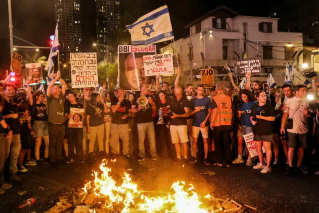 Während einer regierungskritischen Demonstration in Tel Aviv am 15. Juni 2024 vor einem Lagerfeuer. Sie fordern auch vorgezogene Wahlen.