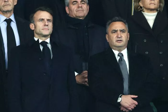 Der französische Präsident Emmanuel Macron und der israelische Botschafter in Frankreich, Joshua Zarka, am 14. November 2024 bei einem Fußballspiel zwischen Frankreich und Israel.