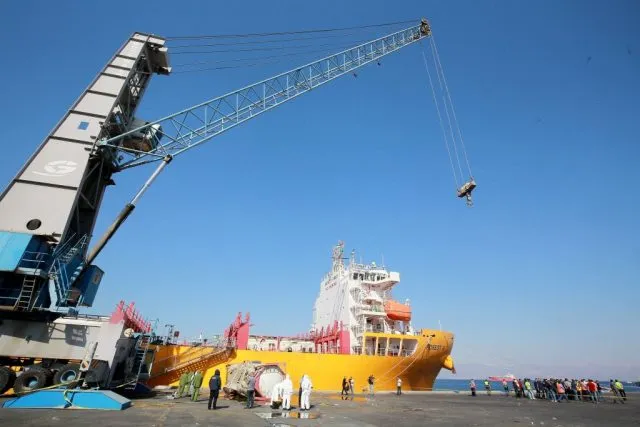 Der Unglückskran an der Unfallstelle. 28. Juni 2022 in Akaba, Jordanien.