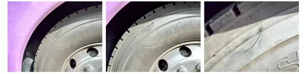 Eine Beschädigung in der Seitenwand eines Reifens eines Shen Yun-Tourbusses „sah aus wie ein frischer Schnitt“, so die Polizei von Costa Mesa, Kalifornien, am 15. März 2024. Der Reifen war so zerschnitten, dass er nicht sofort Luft verlor, sondern offenbar erst bei der Fahrt auf der Autobahn platzen sollte.