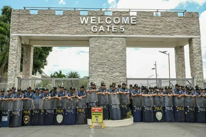 Polizei sichert den Luftwaffenstützpunkt Villamor, vor dem Anhänger von Duterte am 11. März 2025 in Pasay, Metro Manila, protestieren.