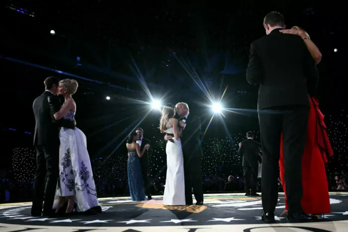 Präsident Donald Trump und First Lady Melania Trump (Mitte), Vizepräsident JD Vance (hinten) und seine Frau Usha Vance sowie Trumps Tochter Ivanka Trump (2.v.l.) und ihr Ehemann Jared Kushner tanzen während des Liberty Inaugural Balls im Walter E. Washington Convention Center in Washington, am 20. Januar 2025.