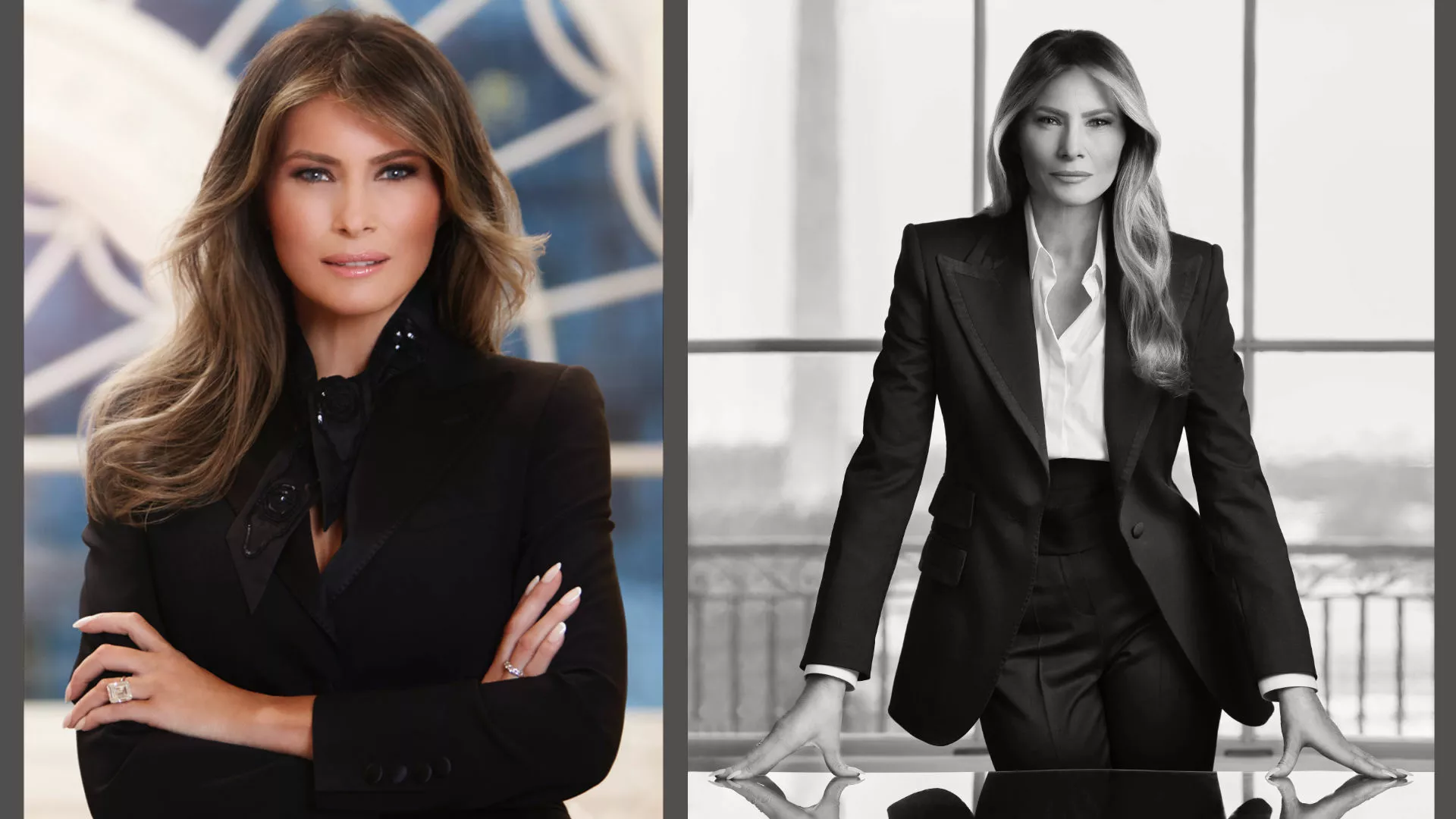 (Links) Das erste offizielle Porträt von First Lady Melania Trump im Weißen Haus 2017, aufgenommen von der Fotografin Régine Mahaux. (Rechts) Das neue offizielle Porträt von First Lady Melania Trump, aufgenommen am 21. Januar 2025 im Yellow Oval Room des Weißen Hauses.