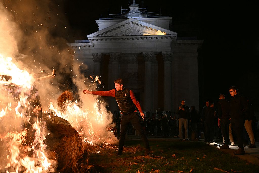 Ein Demonstrant wirft Heu in ein Feuer während einer von der französischen Gewerkschaft Fédération Nationale des Syndicats d’Exploitants Agricoles (FNSEA) organisierten Bauernkundgebung gegen das Mercosur-Handelsabkommen vor der Präfektur Seine-Maritime in Rouen, Nordfrankreich, am 12. November 2025.
