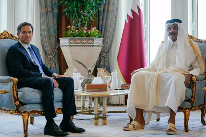 US-Außenminister Marco Rubio trifft sich am 16. September 2025 mit dem Emir von Katar, Scheich Tamim bin Hamad al-Thani, im Amiri Diwan in Doha.
