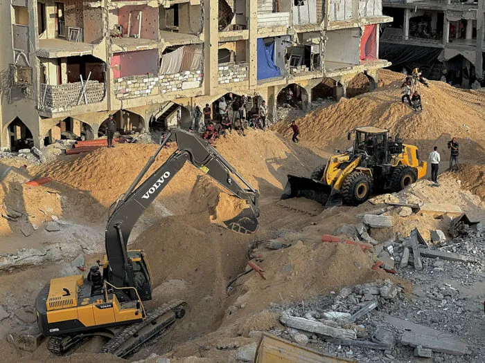 Am 26. Oktober 2025 graben Teams in Hamad City, westlich von Khan Yunis, Gaza, nach den sterblichen Überresten der Geiseln.