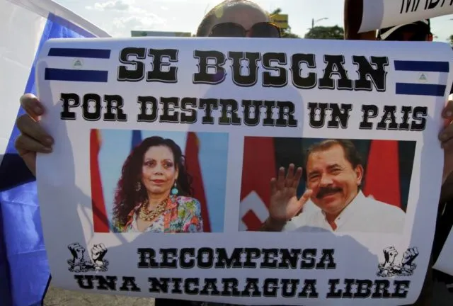 Plakat eines Demonstranten mit den Gesichtern von Daniel Ortega und seiner Frau Rosario Murillo. „Gesucht für die Zerstörung eines Landes. Belohnung: ein freies Nicaragua.“