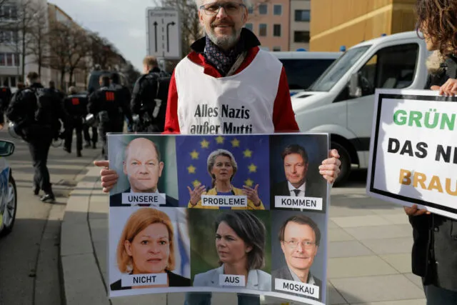 (Von oben links im Uhrzeigersinn) Bundeskanzler Olaf Scholz, die Präsidentin der Europäischen Kommission Ursula von der Leyen, Wirtschaftsminister Robert Habeck, Gesundheitsminister Karl Lauterbach, Außenministerin Annalena Baerbock und Innenministerin Nancy Faeser – während einer Demonstration für Frieden und gegen die Lieferung deutscher Waffen an die Ukraine am Rande der Münchner Sicherheitskonferenz (MSC) in München , Süddeutschland, am 18. Februar 2023.