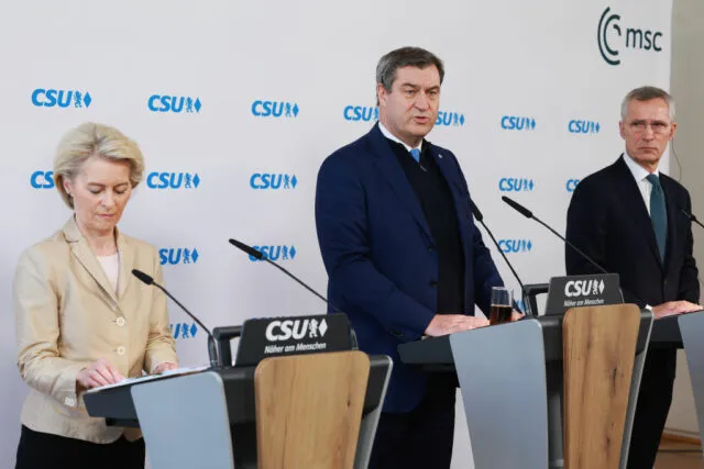 NATO-Generalsekretär Jens Stoltenberg (r.) und Ursula von der Leyen, Präsidentin der Europäischen Kommission, hören zu, wie Markus Söder, Ministerpräsident Bayerns (Mitte), während der Münchner Sicherheitskonferenz 2024 am 16. Februar spricht.