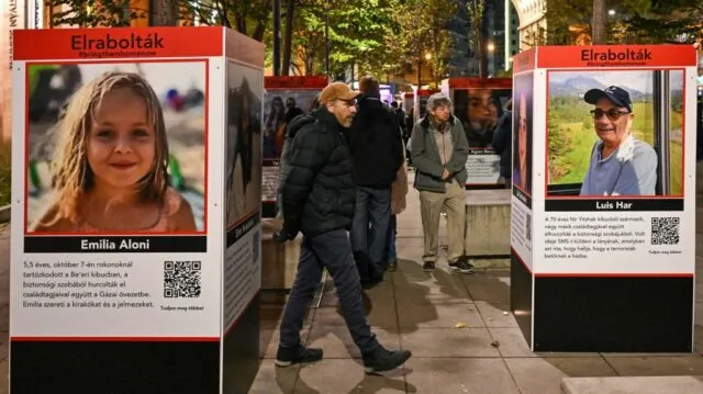 in Budapest erregen Informationstafeln mit Fotos israelischer Geiseln große Aufmerksamkeit. Am 25. November gab es verschiedene Gedenkfeiern für die Geiseln, die von der Hamas festgehalten werden oder wurden.