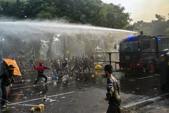 Wasserwerfer werden eingesetzt, um Demonstranten während einer Protestaktion gegen die Mobile Brigade Corps (Brimob) zu vertreiben, nachdem in der Nacht zuvor ein Motorradtaxifahrer ums Leben gekommen war. Die Aktion fand am 29. August 2025 vor der Residenz des Gouverneurs in Surabaya statt.
