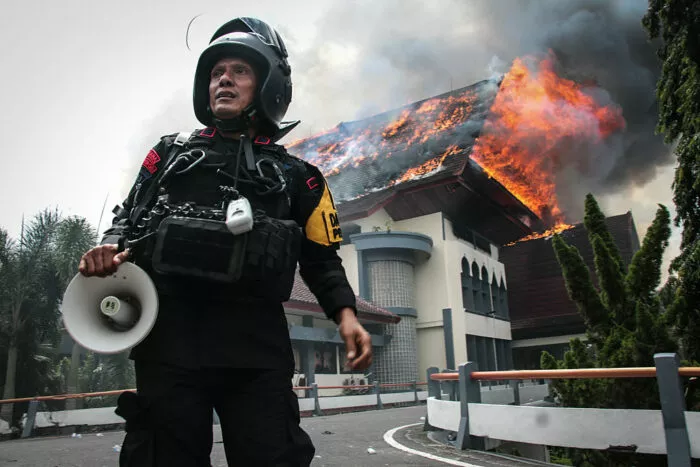 Ein Polizist mit einem Megafon, während das Gebäude des Provinzrats von West-Nusa Tenggara brennt, nachdem es am 30. August 2025 von Demonstranten in Mataram auf der Insel Lombok, West-Nusa Tenggara, in Brand gesetzt wurde.