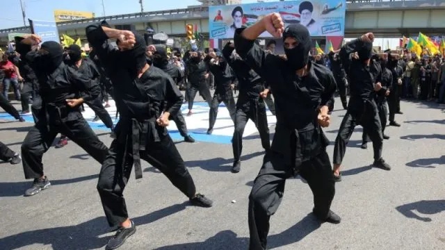 Irakische schiitische Kämpfer von der vom Iran unterstützten Terrorgruppe Hisbollah während einer Militärparade, die am 31. Mai 2019 den Internationalen Tag Al-Quds in Bagdad feiert.