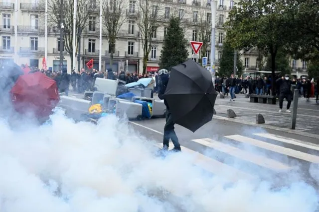 Tränengaswolken am Rande einer Demonstration am 11. März 2023 in Nantes, Westfrankreich.