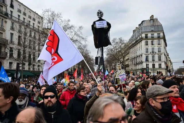 Während einer Demonstration in Paris am 11. März 2023. Die von der Regierung beschlossene Reform beinhaltet die Anhebung des Mindestrentenalters von 62 auf 64 Jahre und die Erhöhung der Anzahl der Beitragsjahre, die man für eine volle Rente einzahlen muss.