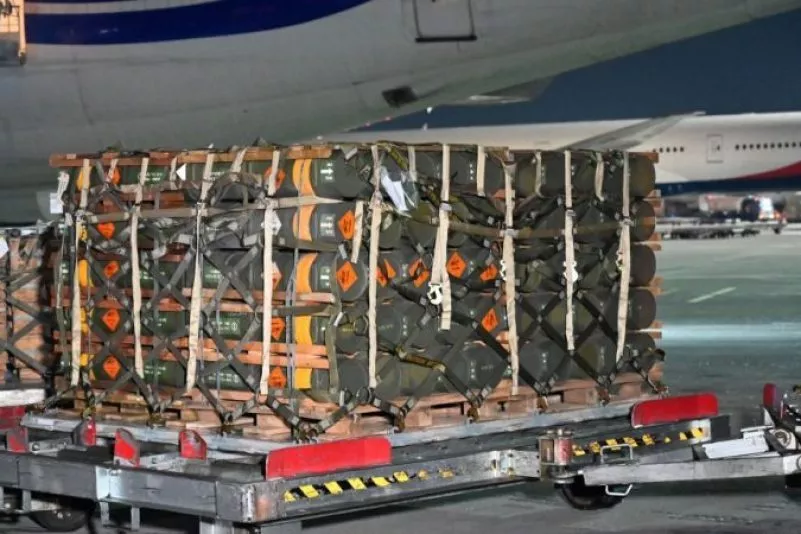 Eine Lieferung militärischer Hilfsgüter der USA an die Ukraine wird am Flughafen-Boryspil transportiert.