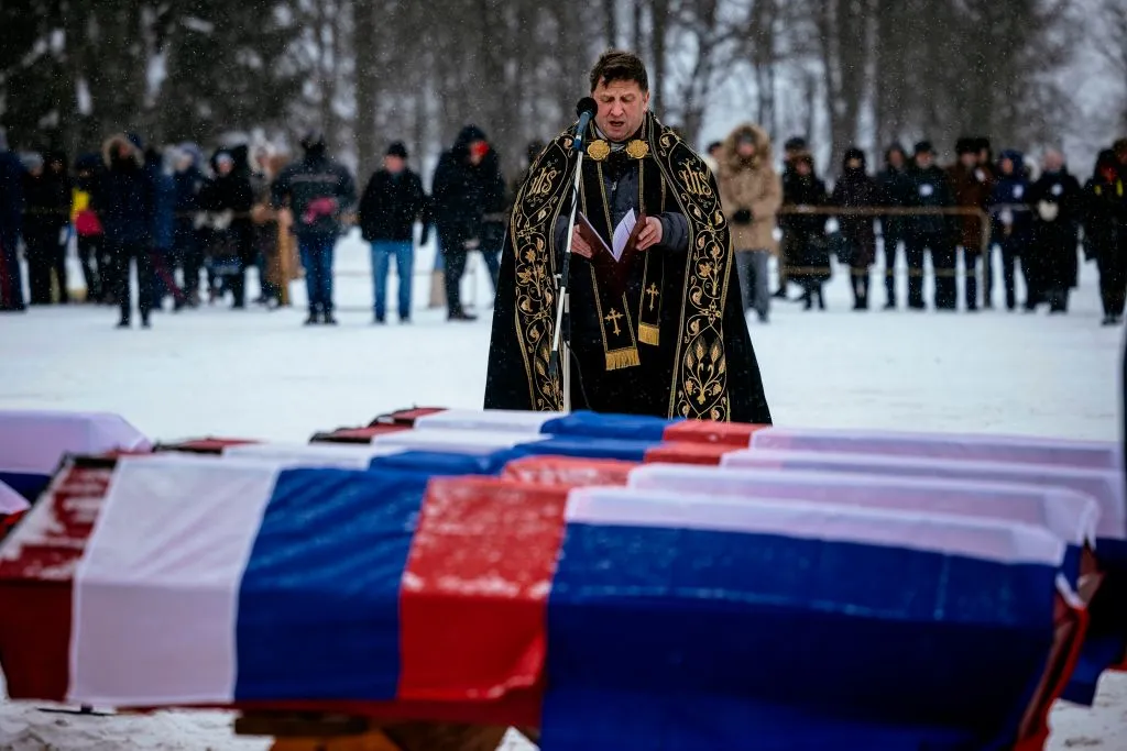 Ein katholischer Priester betet während einer Bestattungszeremonie in der westlichen Stadt Vyazma am 13. Februar 2021 neben Särgen mit Überresten russischer und französischer Soldaten.