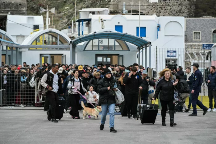 Einwohner der griechischen Insel Santorini, die sich am 4. Februar 2025 auf ihre Abreise nach den wiederholten Erdbeben vorbereiten.