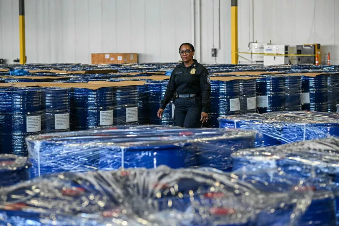 Ein Beamter der US-Zoll- und Grenzschutzbehörde in Pasadena, Texas, am 3. September 2025 zwischen Fässern mit Chemikalien, die zur Herstellung synthetischer Drogen wie Methamphetamin verwendet werden. (Symbolbild).