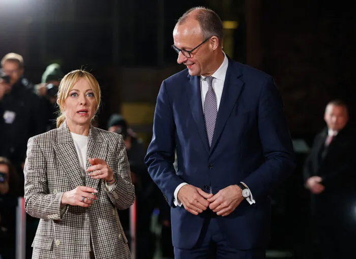 Die italienische Ministerpräsidentin Giorgia Meloni wird am 15. Dezember 2025 von Bundeskanzler Friedrich Merz im Bundeskanzleramt in Berlin empfangen.