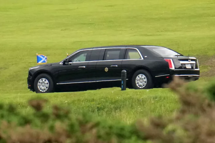 Die Präsidentenlimousine von US-Präsident Donald Trump während seines Besuchs auf dem Golfplatz Trump Turnberry am 26. Juli 2025 in Turnberry, Schottland. Trump besucht Schottland vom 26. bis 29. Juli – auch seinen Golfplatz Trump Turnberry sowie Trump International Golf Links in Aberdeenshire.
