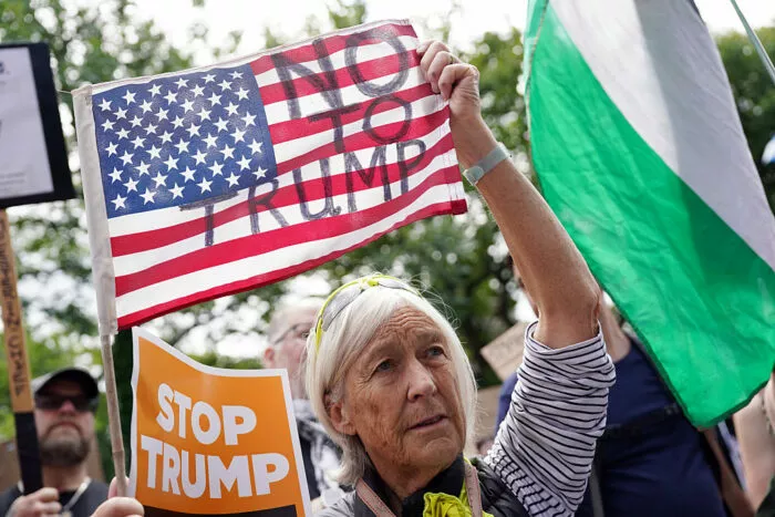 Demonstranten auf den Straßen von Edinburgh gegen den Besuch des US-Präsidenten Donald Trump in Schottland am 26. Juli 2025 in Edinburgh.