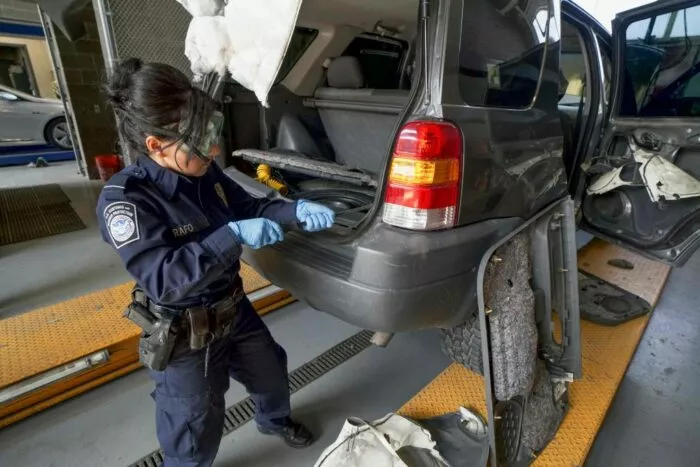 Eine Beamtin des US-Zoll- und Grenzschutzes durchsucht ein Auto auf Schmuggelware in San Ysidro, Kalifornien, auch auf die Droge Fentanyl, die als ein starkes Schmerzmittel von der US-amerikanischen Food and Drug Administration für eine Reihe von Erkrankungen zugelassen wurde.