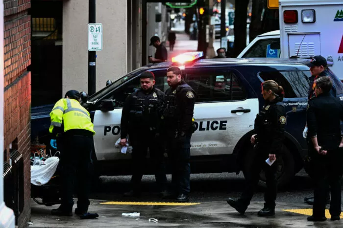 Polizeibeamte in Portland stehen während eines Notfalleinsatzes von Rettungssanitätern bei einem Patienten nach der Verabreichung einer Überdosis Fentanyl in Form von Naloxon Nasenspray am 25. Januar 2024.