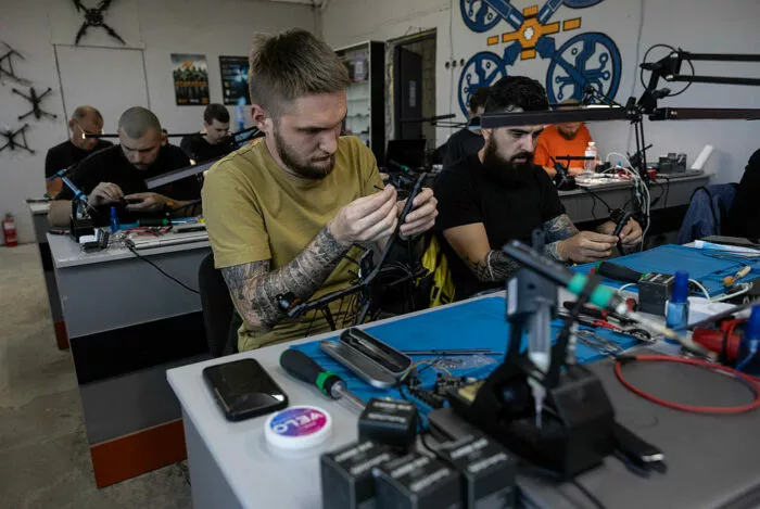 Teilnehmer in einem Workshop am 3. September 2025 in der Region Kiew, lernen, Drohnen zusammenzubauen und zu fliegen. Sowohl zivile als auch militärische Teilnehmer sind beteiligt.