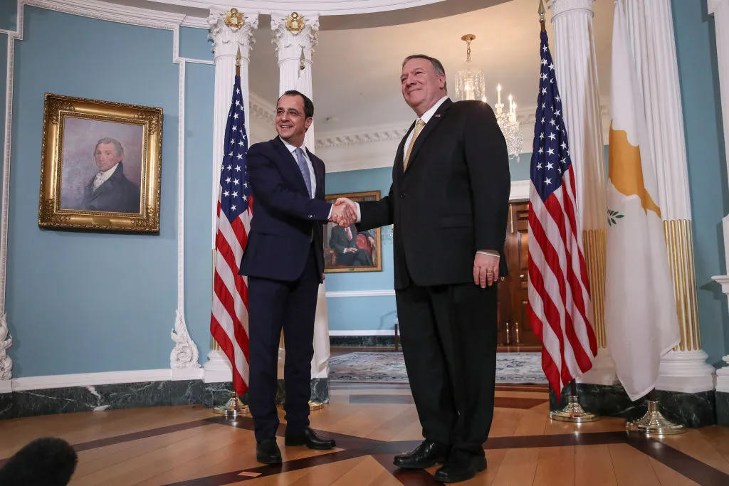 Der Außenminister der Republik Zypern, Nikos Christodoulides, und US-Außenminister Mike Pompeo schütteln sich bei einem Fototermin vor einem Treffen im US-Außenministerium am 18. November 2019 in Washington, DC die Hände.