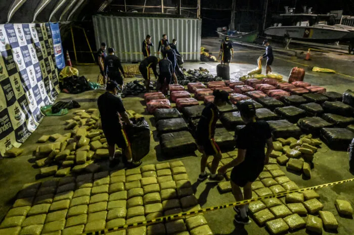 Auch andere Staaten gehen gegen die Kartelle vor: Die kolumbianische Marine sortiert Marihuana-Pakete, nachdem am 10. März 2024 in der Nähe des Hafens von Buenaventura im Departement Valle del Cauca, Kolumbien, ein Boot mit etwa 2,5 Tonnen Marihuana beschlagnahmt wurde.