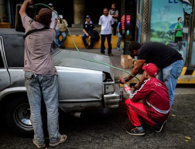 Menschen zweigen Benzin aus ihrem Auto ab. 8. März 2019, Caracas.