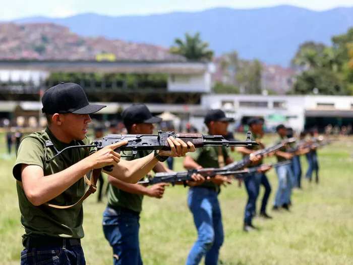 Mitglieder der Bolivarischen Nationalmiliz nehmen am 13. September 2025 an einer militärischen Ausbildung in Fuerte Tiuna in Caracas, der Hauptstadt Venezuelas, teil. Der venezolanische Präsident Maduro rief dazu auf, sich ausbilden zu lassen und „das Schießen zu lernen“.