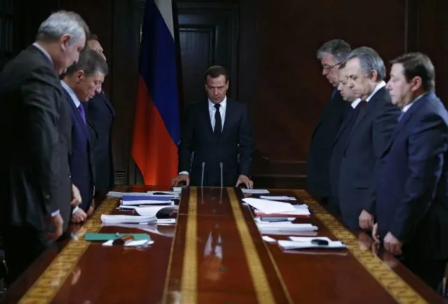 Russlands Premierminister Dmitri Medwedew und sein Kabinett gedenken mit einer Schweigeminute den Opfern des Brands. 26. März 2018.