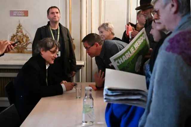 Der Verlagsleiter, Cartoonist und Schriftsteller Laurent Sourisseau, bekannt als Ris (L), spricht mit Lesern nach einer Diskussion über die Pressefreiheit während des Weltforums für Demokratie am 2. November 2019 in Straßburg.
