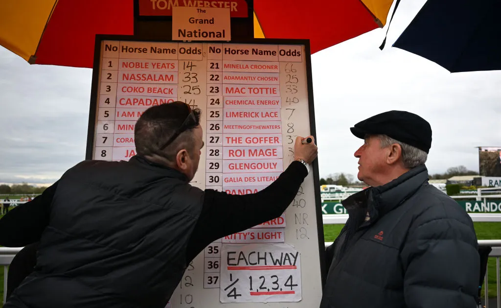Für viele ist mit dem Begriff „Wetten” wohl am ehesten das traditionelle Pferderennen verbunden. Selbstverständlich gibt es diese auch in der modernen Welt weiterhin. Das Bild zeigt einen Wettstand, der vor dem letzten Tag des Grand-National-Pferderennens in Aintree, England, am 13. April 2024 vorbereitet wird.