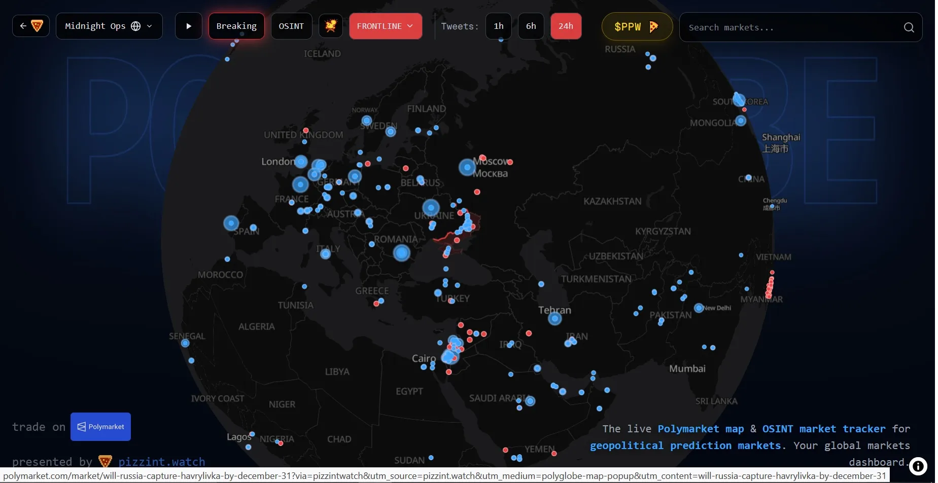Die Polyglobe-Anwendung bietet mithilfe eines interaktiven Globus Informationen zu den Wetten auf Polymarket. So enthält sie beispielsweise Fast-Echtzeit-Meldungen von der ukrainischen Front.