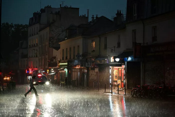 Ein Mann bringt sich während eines Gewitters auf einer Straße im 20. Arrondissement in Paris am 25. Juni 2025 in Sicherheit.