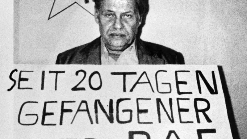 Dieses Bild, das wahrscheinlich am 25. September 1977 aufgenommen wurde, zeigt den Präsidenten der Bundesvereinigung der Deutschen Arbeitgeberverbände Hanns-Martin Schleyer mit einem Schild „Seit 20 Tagen Gefangener der R.A.F.“, nachdem er von Mitgliedern der Roten Armee Fraktion (RAF) als Geisel genommen worden war. Schleyer wurde am 5. September 1977 in Köln entführt und am 18. Oktober 1977 in Mulhouse, Frankreich, tot im Kofferraum eines Autos gefunden.