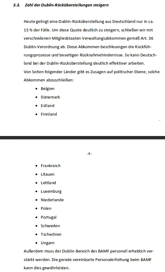 SPD und CSU: „Heute gelingt eine Dublin-Rücküberstellung aus Deutschland nur in ca. 15 % der Fälle. Um diese Quote deutlich zu steigern, schließen wir mit verschiedenen Mitgliedstaaten Verwaltungsabkommen gemäß Art. 36 Dublin-Verordnung ab.“