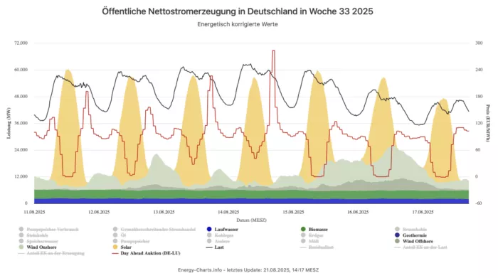 Deutsche Stromerzeugung durch „Erneuerbare“ mit der Last (schwarze Linie) und dem Börsenstrompreis der Day-Ahead-Auktion (rote Linie) von Kalenderwoche 33 (11. bis 17. August).