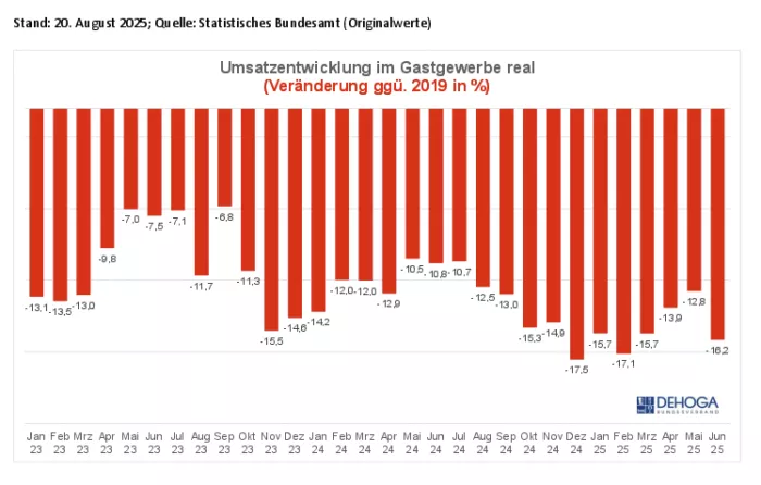 Das deutsche Gastgewerbe steckt bis heute tief in der Krise: Auf der DEHOGA-Pressekonferenz Anfang September in Berlin gab der Verband an, dass das Gastgewerbe nach vorläufigen Ergebnissen im ersten Halbjahr dieses Jahres real 15,1 Prozent weniger umsetzt als im Jahr 2019, einem Jahr vor der Corona-Krise. Der Branchenverband beruft sich nach eigenen Angaben dabei auf Zahlen des Statistischen Bundesamtes. Dieses hatte im August gemeldet, dass der Umsatz im Gastgewerbe im ersten Halbjahr 2025 im Vorjahresvergleich real um 3,7 Prozent gesunken sei.