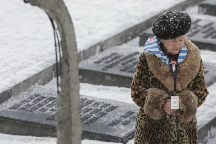OSWIECIM, POLEN – 27. Januar: Eine Überlebende von Auschwitz geht am Hauptdenkmal während der Zeremonie zum 60. Jahrestag der Befreiung des Lagers durch die Rote Armee am ehemaligen Konzentrationslager Auschwitz II, auch Birkenau genannt, am 27. Januar 2005 in Oswiecim, Polen, vorbei. Überlebende standen neben Weltführern, um feierlich den mehr als einer Million Menschen, überwiegend Juden, zu gedenken, die in Auschwitz von den Nazis ermordet wurden. (Archiv)