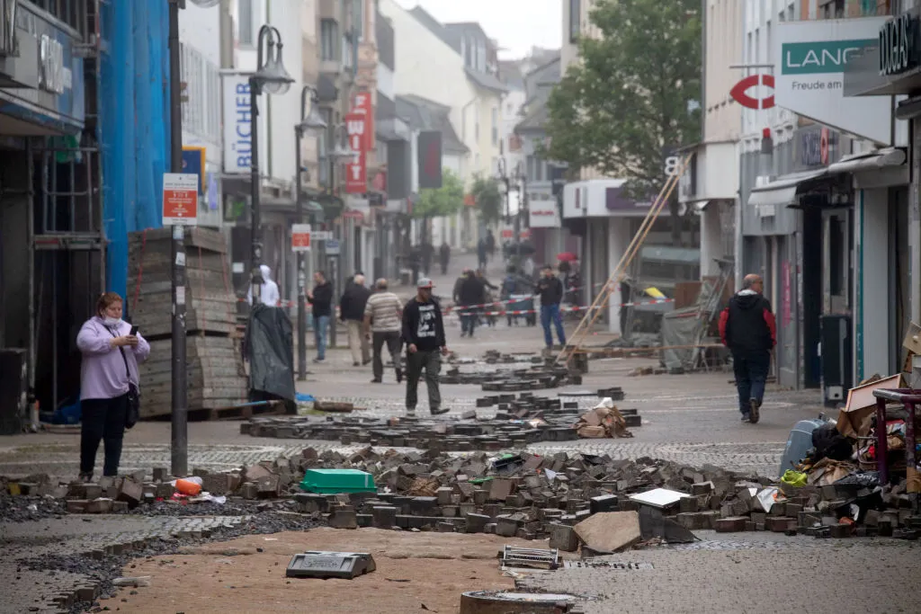 Unterdessen hat sich im nordrhein-westfälischen Erftstadt hat die Lage wegen der Unwetterkatastrophe dramatisch zugespitzt. Wegen schneller und massiver Unterspülungen gebe es eine Reihe von vollständigen und teilweisen Einstürzen von Häusern, teilte die Bezirksregierung in Köln am Freitag mit. Es würden „etliche Personen“ vermisst, die Infrastruktur sei ausgefallen, Krankenhausbetriebe seien nicht mehr möglich. Mehrere Pflegeheime müssten geräumt werden.